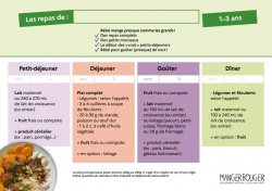 La troisème fiche reprend les principaux éléments à avoir en tête pour l'alimentation de son enfant de 1 à 3 ans, âge à partir duquel bébé mange presque comme les grands.