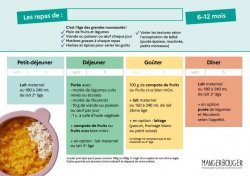 Cet outil est constitué de trois fiches proposant, pour trois tranches d'âges entre 0 et 3 ans, un résumé des recommandations en matière de diversification alimentaire et une proposition de plan alimentaire sur une journée. Ce plan reprend à chaque fois les quatre temps de repas (petit-déjeuner, déjeuner, goûter et dîner) et indique ce qu'il convient de donner à son enfant et en quelle quantité (lait, purée de légumes, de féculents, compotes, ajout de matières grasses, ...). Il est possible de personnaliser la fiche en ajoutant les horaires des repas de bébé ainsi que son prénom.