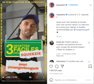 Les 6 premières recettes sont également présentées en vidéo sur la page instagram de l'influenceur français Squeezie @xsqueezie aves presque 7M d'abonnés. Ces vidéos permettent de mettre en image de façon humoristique ces recettes et de démontrer leur simplicité.